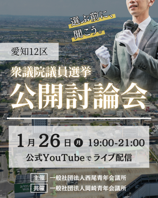 衆議院選挙目前! 公開討論会を開催 一般社団法人西尾青年会議所では、衆議院議員総選挙への愛知12区 立候補予定者による公開討論会を開催します! 本討論会では、コ・・・
